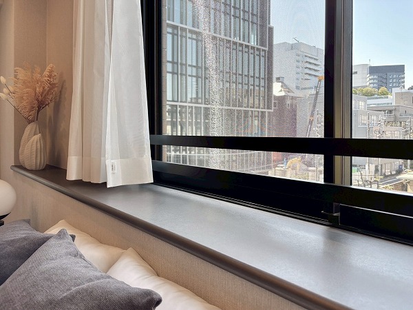 どっしりとしたタイル張りの外観が目を惹く『グランフォルム六番町』。地下1階付き地上13階建て、総戸数82戸の大きなマンションです。アウトフレーム設計になっていて、室内に柱や梁が張り出ておらず、家具の設置がしやすいというメリットが。
