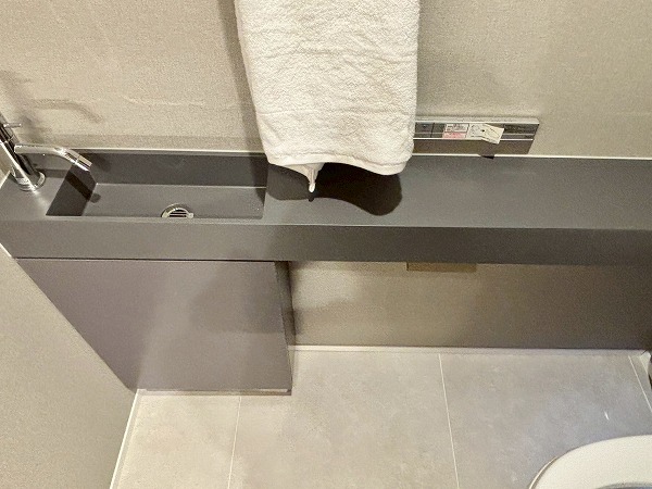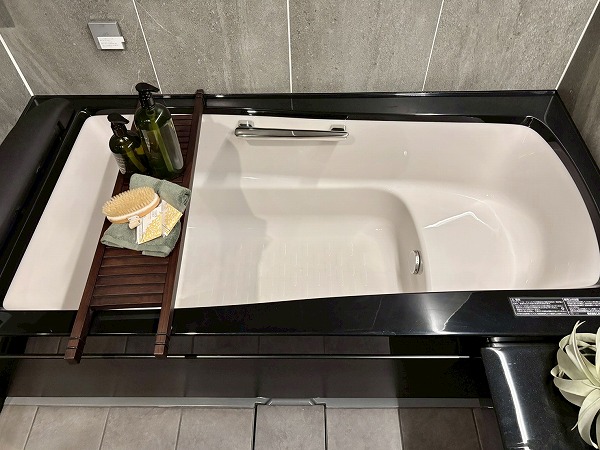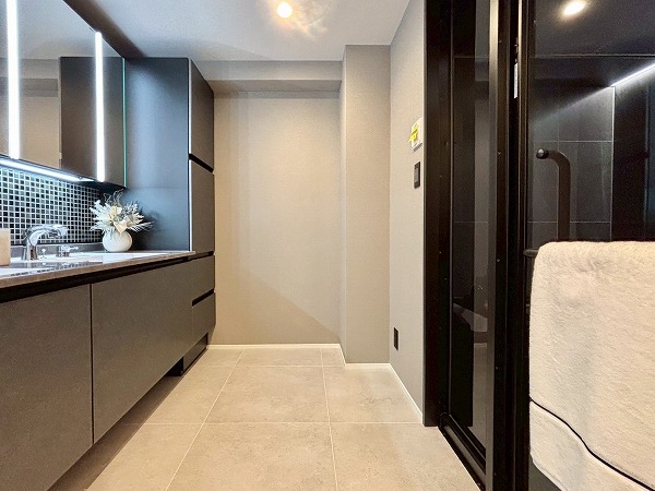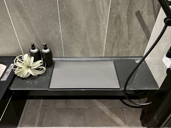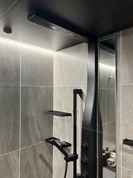 クリアなブラックのドアを開けると、1620サイズのバスルームが広がっています。ブラックを基調としたクールなデザインです。シャワーの傍にベンチがあり、腰かけて利用できるのが便利ですね。また、ハンドシャワーとオーバーヘッドシャワーの2つがあり、用途に合わせて使い分けられます。