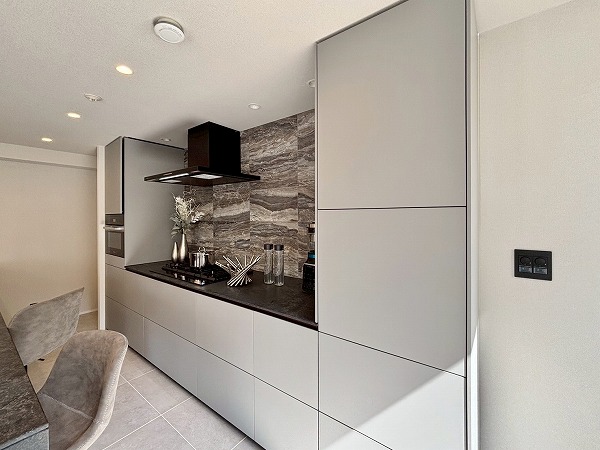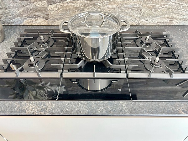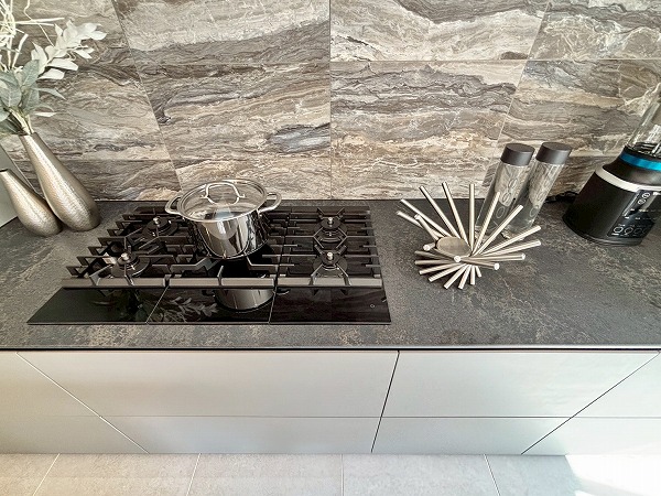 タイル張りで高級感あるシステムキッチンは、イタリアの最高級キッチンブランドValcucine製。シンク・食洗機とコンロ・コンベックに分かれたセパレートタイプなので、作業しやすいのが嬉しいですね。リンナイ製のガスコンロは、なんと5口です♪