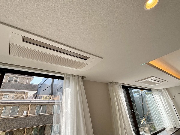 リビングダイニングキッチンは約23.0帖。2面採光になっていて、とっても明るい空間でした!これだけゆとりがあれば、自由に家具をレイアウトできますね。2基のエアコンと床暖房がお部屋を快適に保ちます。