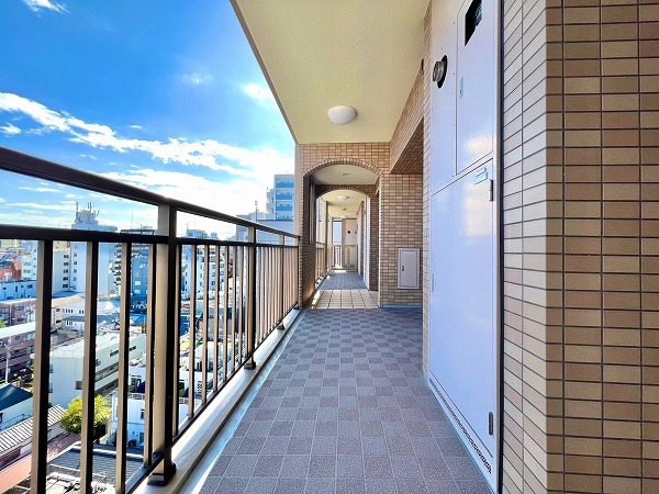 エレベーターの他に開放的な外階段もありました。太陽の日が射し込み、明るい気持ちで出発できそうです。体を動かすのがお好きな方は是非外階段をご活用くださいね☀お部屋までは通気性抜群な外廊下を進みます♪