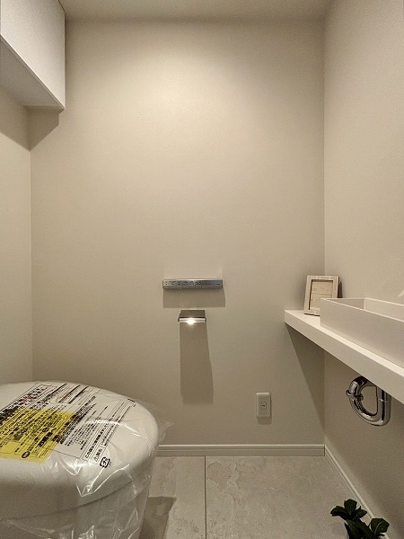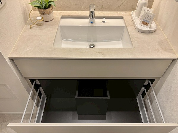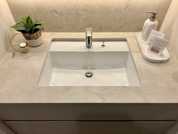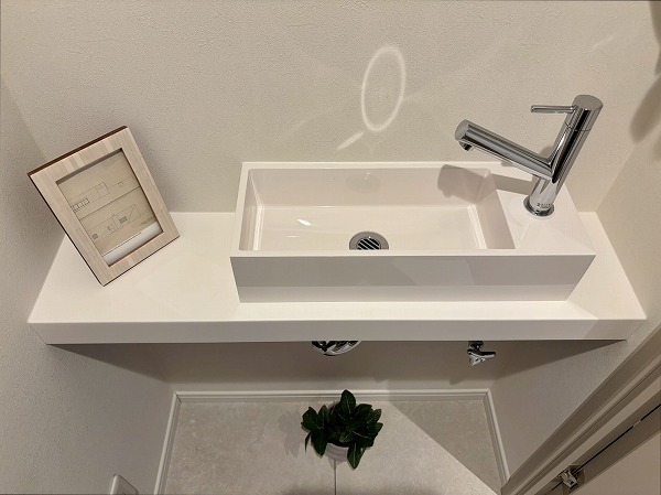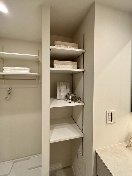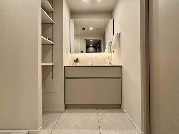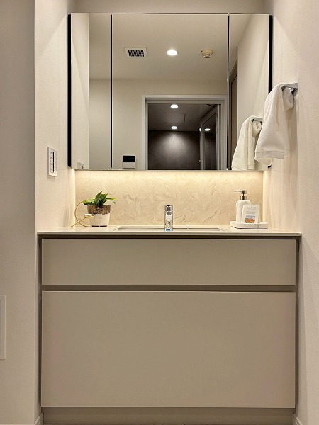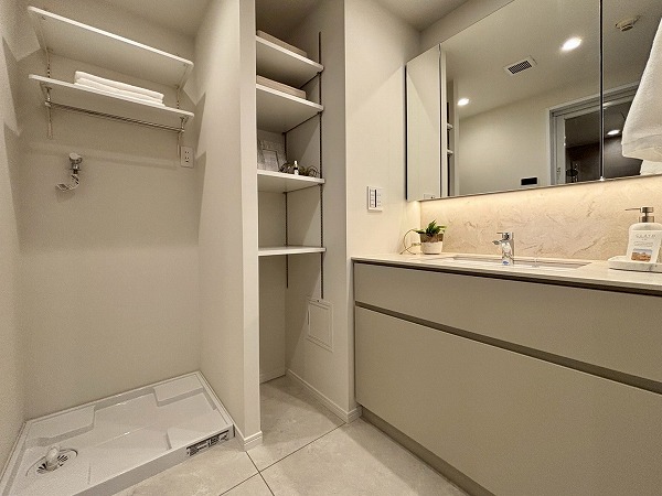 白やベージュを基調とした明るいサニタリールーム。キッチンの傍にドアがあるので行き来がしやすく、お料理と同時にお洗濯やお湯張りが行えます。洗面化粧台はキッチンと同じ田中工藝製。カウンター部分の素材が同じなので統一感がありますね。