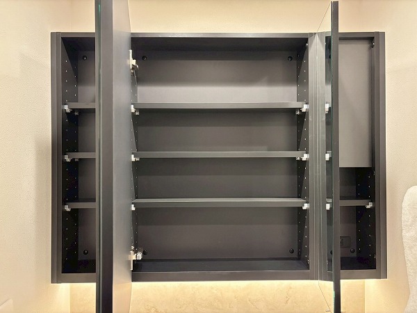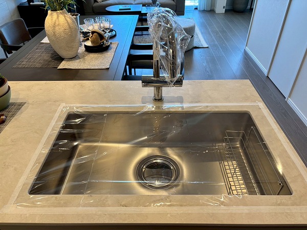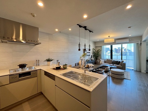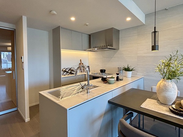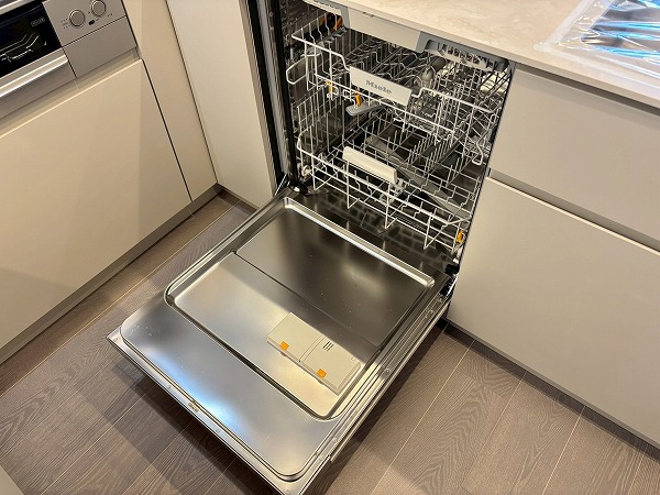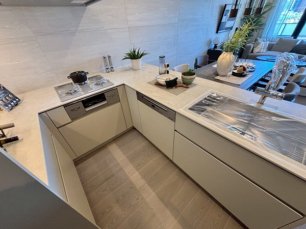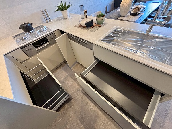 お部屋の雰囲気にマッチしたシステムキッチンは、日本のオーダー家具メーカー田中工藝製。作業スペースが広く、収納豊富と人気なL字型キッチンを採用していますよ。大きなキッチンシンクやフロントオープンタイプの食洗機などを搭載しており、毎日の家事をサポートしてくれます♪