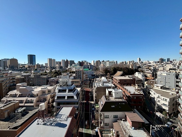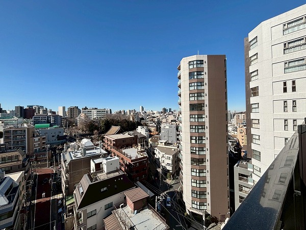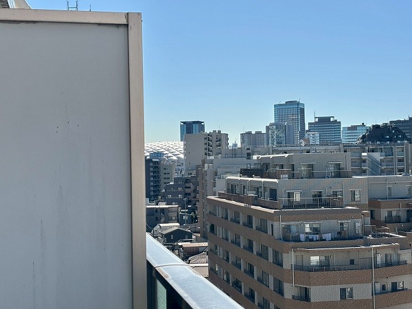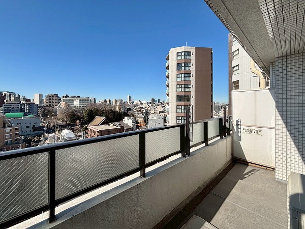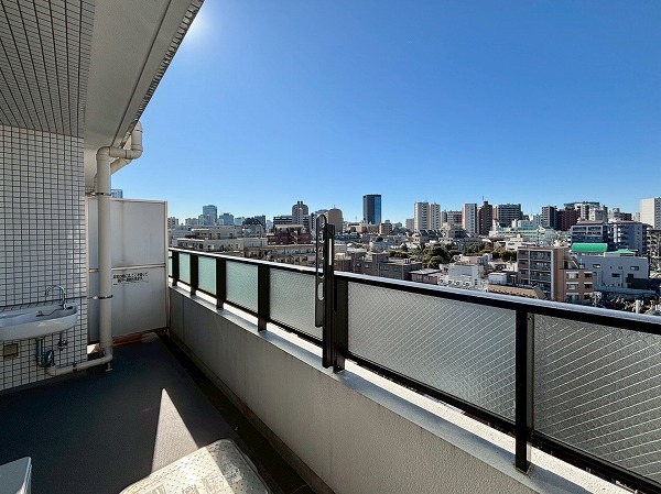 南西向きのバルコニーは9.47㎡。スロップシンクが付いていて、お掃除がしやすいという特徴が。前面に高い建物が無く、遠くの方まで見渡すことができましたよ♩陽当たりもバッチリです。チェアやテーブルを置いて、のんびり過ごしたくなりますね。