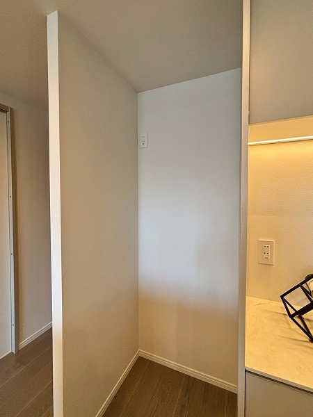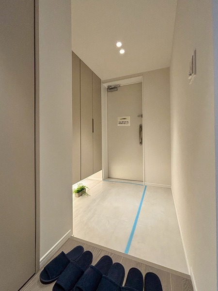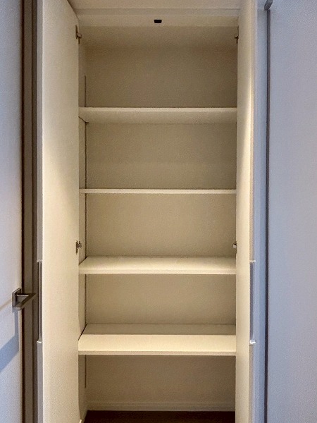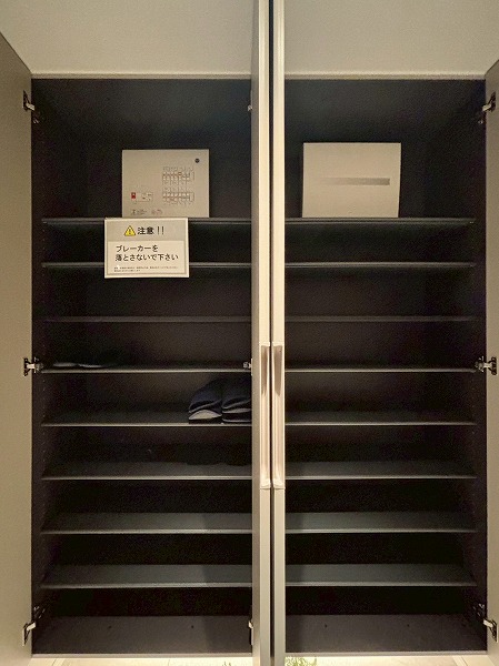 玄関は土間がとても広く、ベビーカーやスーツケースなどお出かけに使うアイテムを一時的に置いておくことができます。シューズボックスもとても大きいですね!廊下を進むと、突き当たりに収納を発見。お掃除道具や日用品のストック置き場としてご利用ください。