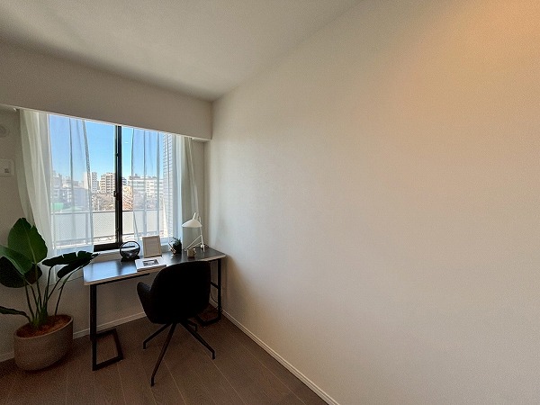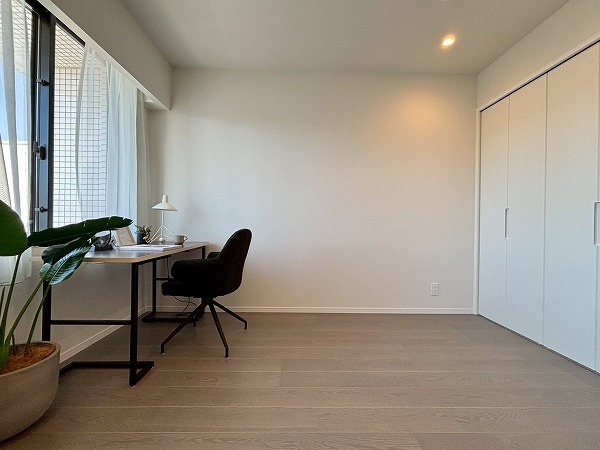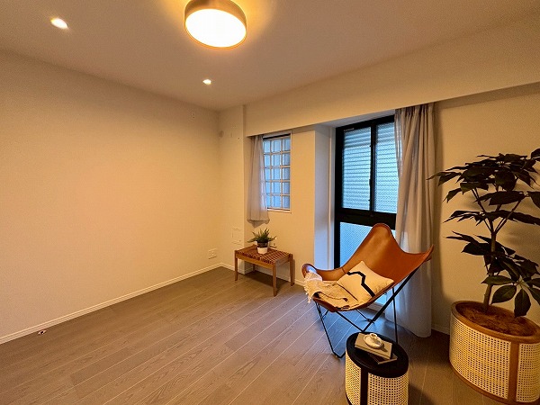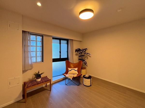 こちらの約7.5帖の洋室なら、キングサイズのベッドも設置可能。ご夫婦で使用する主寝室にピッタリですね。共用廊下に面しており、窓がすりガラスになっているのでプライバシーが守られます。