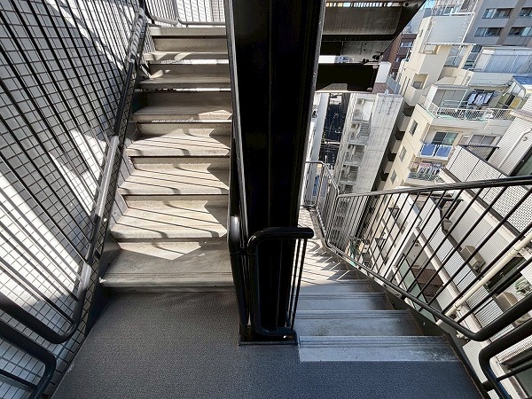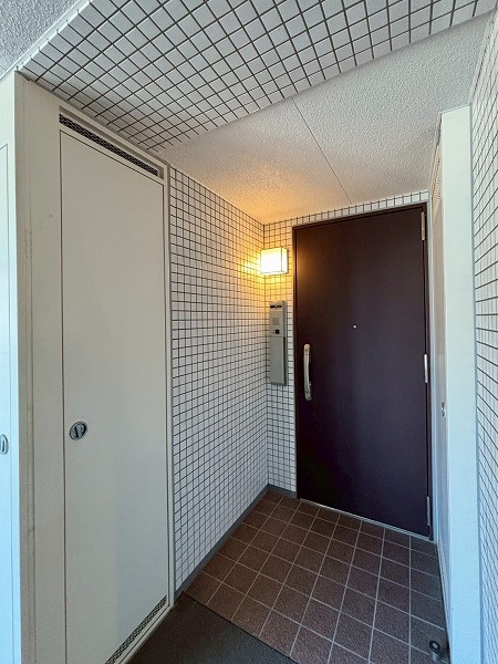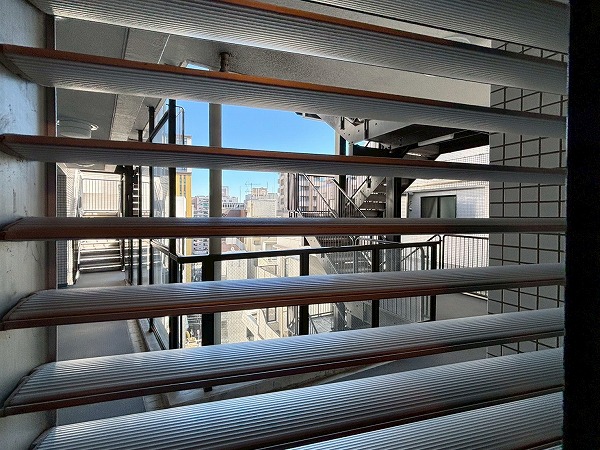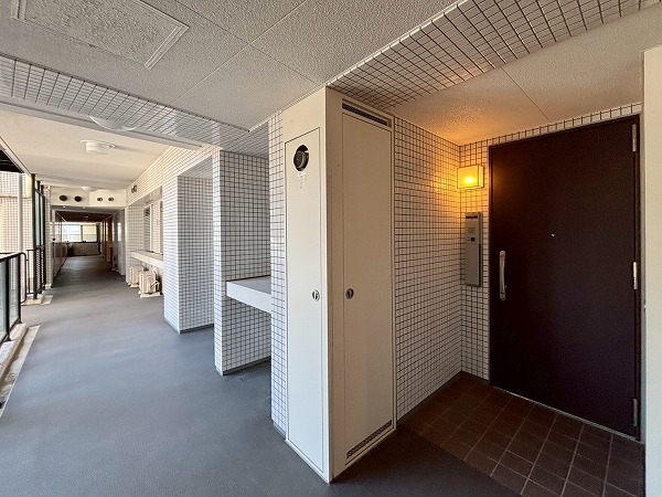 開放的な外廊下に玄関扉が並んでいます。風通しが良く、湿気や匂いが籠りません。玄関前に大きなアルコーブがあり、外から室内の様子が見えにくいようになっていました。