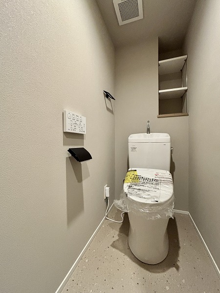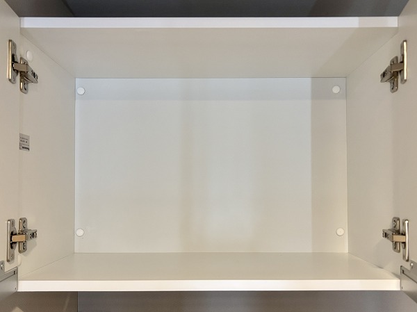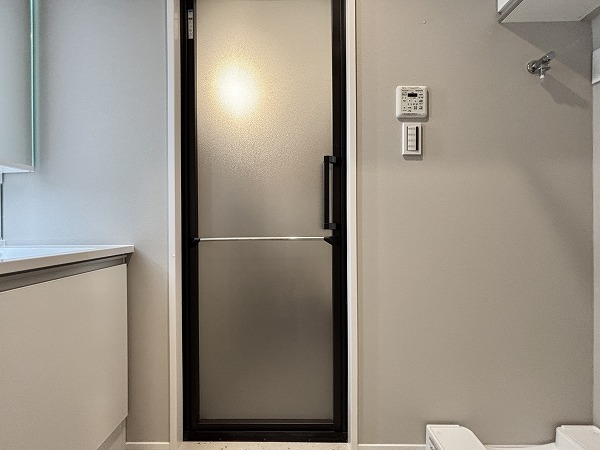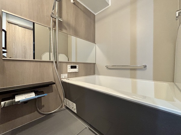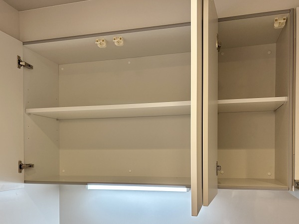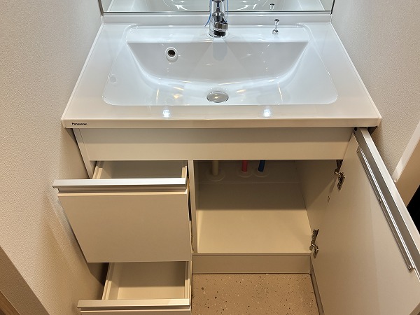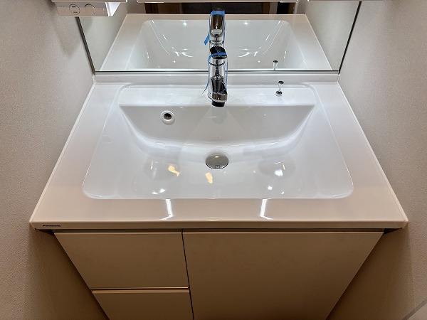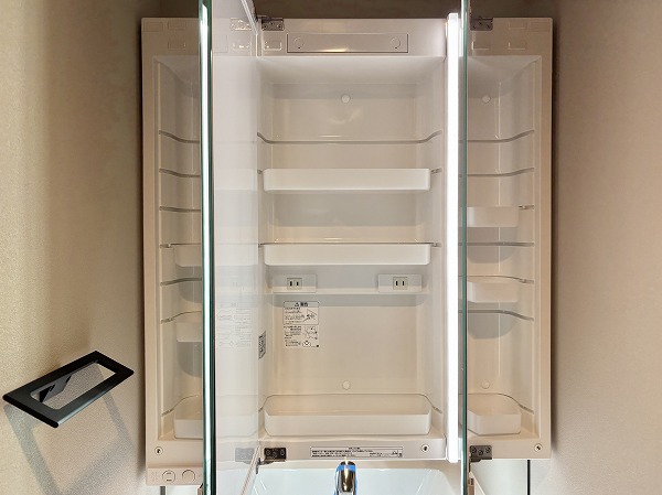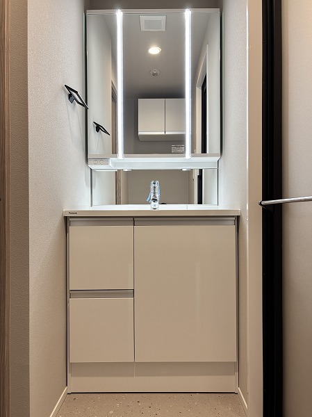 パウダールームは床面に石調のフロアマットが敷かれていてモダンな印象に。シミになりにくく、濡れてもサッと拭き取ればお手入れが終わる手軽さが嬉しいですね。洗面化粧台は縦にLEDミラーが2つ備わっていて、お顔全体をしっかり照らしてくれますよ。