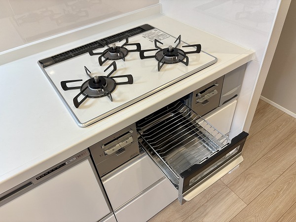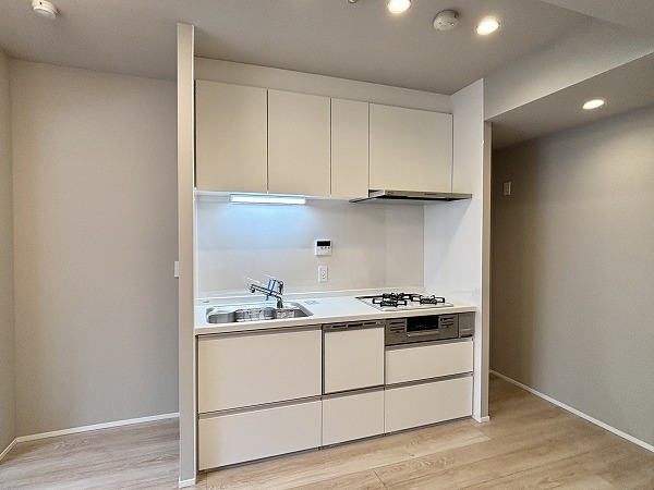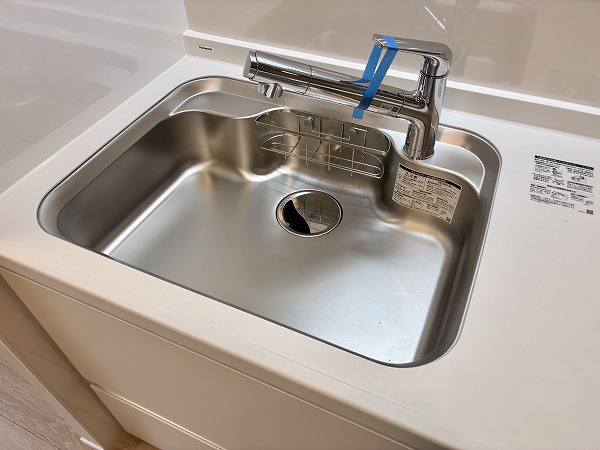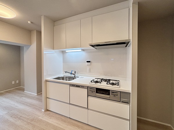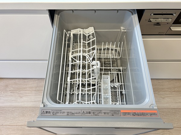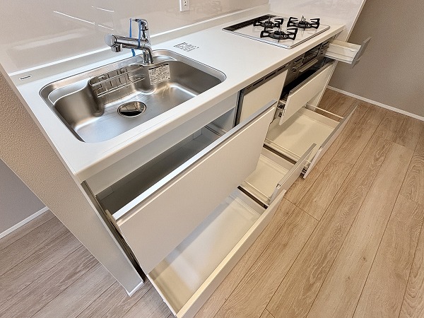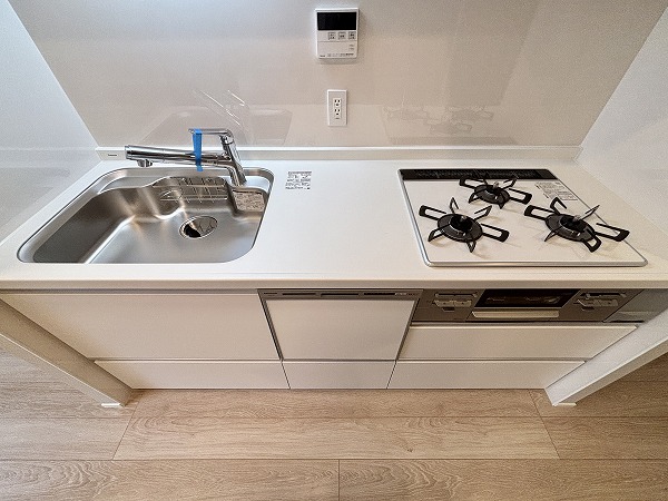 清潔感のある白を基調とした壁付タイプのキッチン。シンクは幅が広く使い勝手が良いデザインです。右下に食洗機があるので、予洗いした食器をそのまま食洗機内に入れることができ動線がスムーズ。