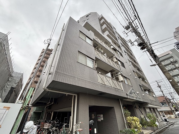 「不忍通り」沿いに佇むタイル張りのマンション、『モンテベルデ千駄木』。地下1階付き地上10階建て、総戸数は32戸と少なめです。角地に立っている上にお隣が駐車場で開けているので、採光面で期待ができます。