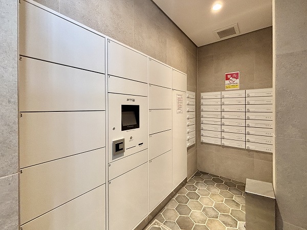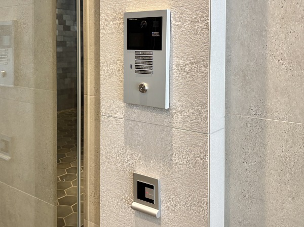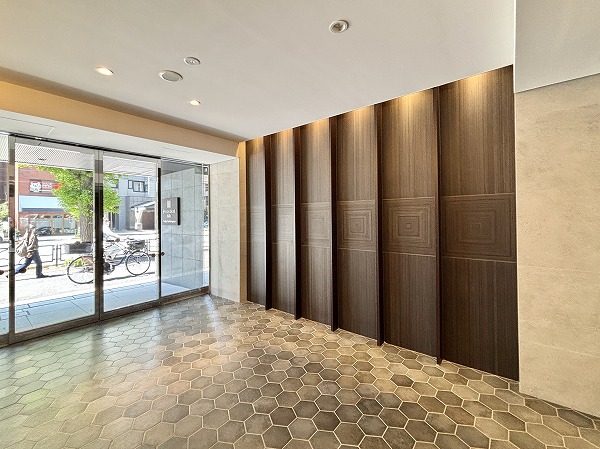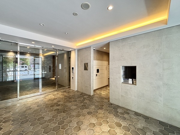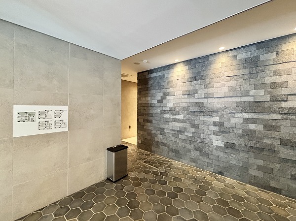 2020年8月築と新しくどこもとても綺麗な状態です。タイル張りの美しいエントランスは、落ち着きと高級感を感じさせるモダンなデザイン。オートロックには鍵穴とタッチキーの両方があり、お好きな方で解錠できますよ。