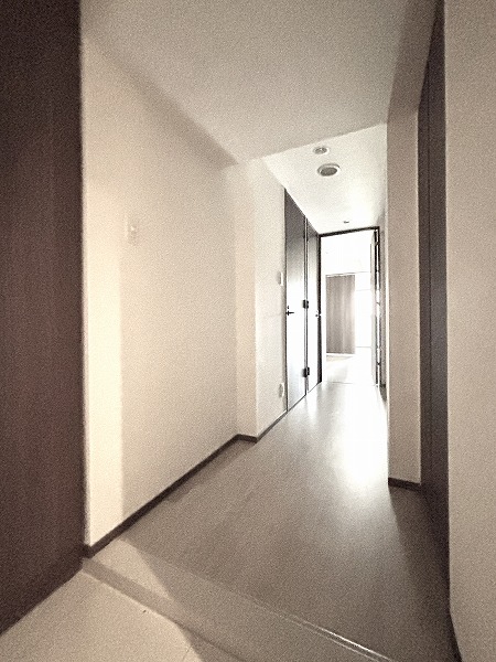 カーペットが敷かれホテルライクな内廊下。外気の影響を受けないため、悪天候の日でも快適にお出かけできます。玄関ドアはツーロックドアな上に、指紋認証で解錠することも可能です。