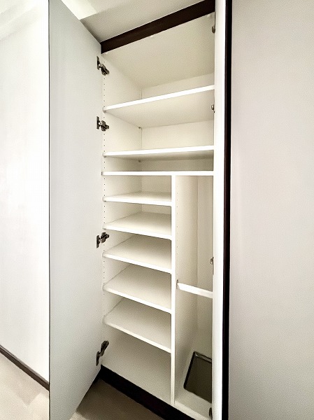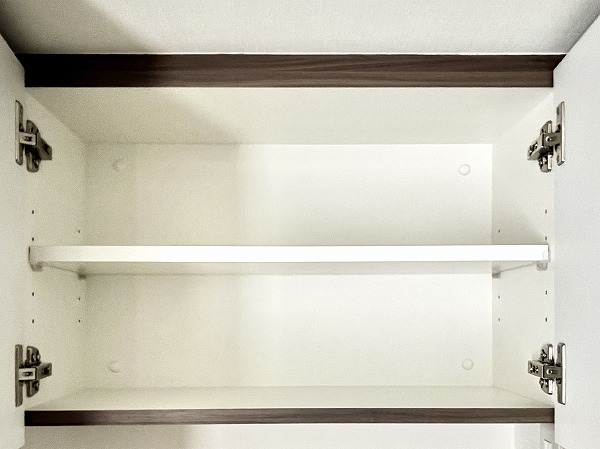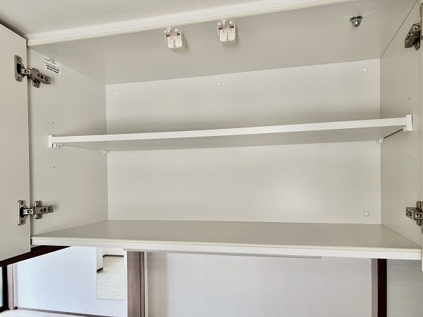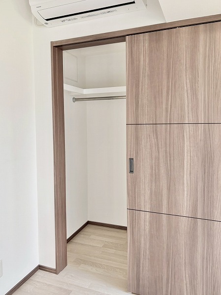 また、洋室にはこちらのウォークインクローゼットも設けられています。奥行きがあり、たくさん荷物をしまえそう。収納ボックスやカラーボックスを使えば整理整頓がしやすくなりますよ。レールが上部にしかない上吊り戸で、お掃除がしやすいという特徴も。