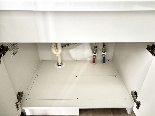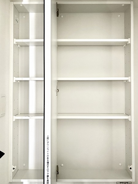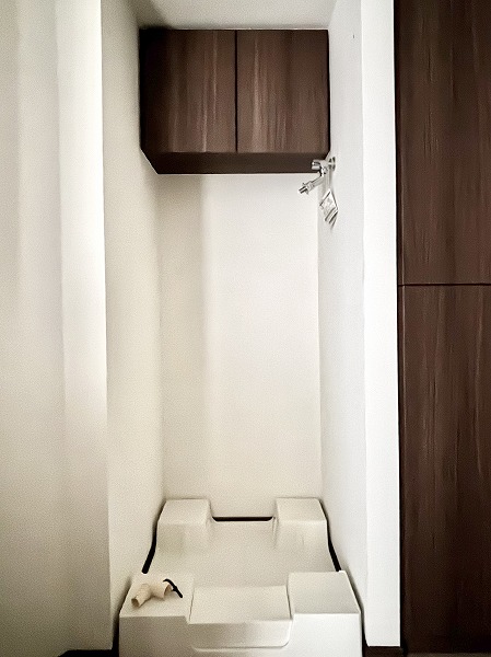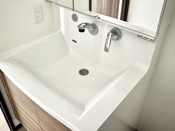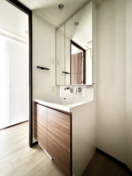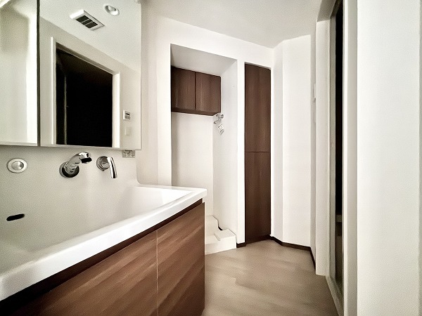 パウダールームは玄関左手に。マンションの形の都合上、多角形型のやや変わった間取りをしています。その分バスルーム側の床が広く、お洗濯物などの作業がしやすそうだと感じました。収納が多く、使い勝手もばっちり。