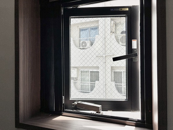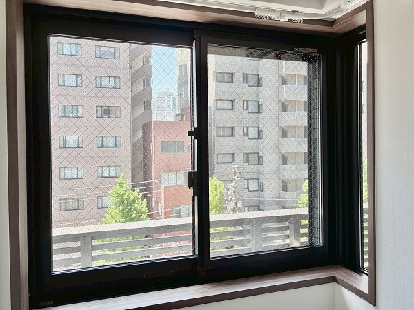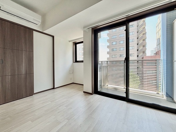 洋室はおよそ4.9帖。バルコニーに面した大きな窓とコーナーサッシがあり、実際の間取りよりも広く感じました。エアコンを搭載しており、オールシーズン快適にお過ごしいただけます。