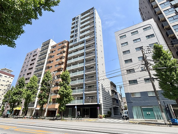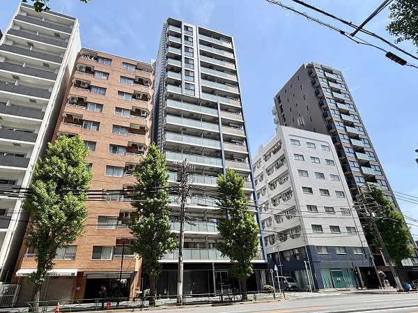 鮮やかなブルーのラインと直線的なフォルムが美しい『プレセダンヒルズ文京本駒込』。地上15階建て総戸数55戸の新耐震マンションです。角地に立っているので、周囲の建物に日差しを遮られないというメリットが。