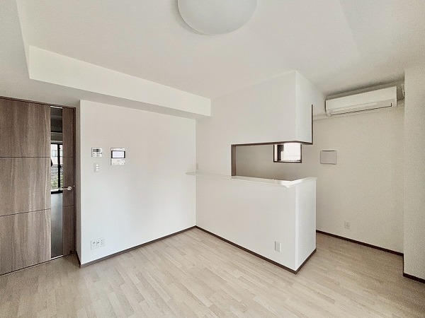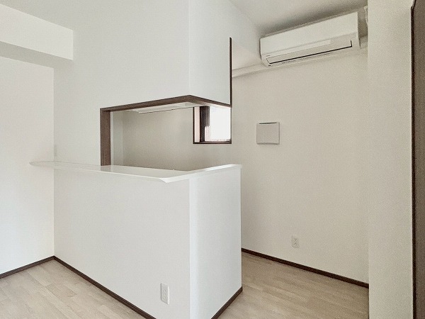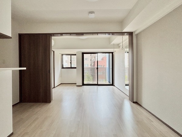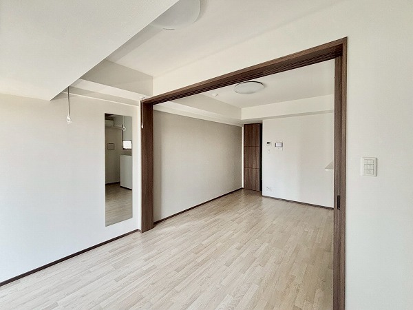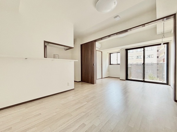 リビングダイニングキッチンはおよそ9.0帖。窓はキッチンの小窓のみですが、洋室との間の引き戸を開けるとしっかり太陽の光を感じることができます。来客時は戸を閉めるなど、フレキシブルに間取りを変更できるのは嬉しいですね。