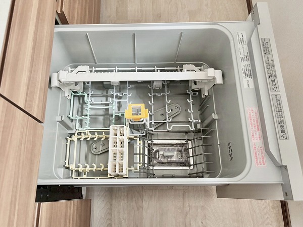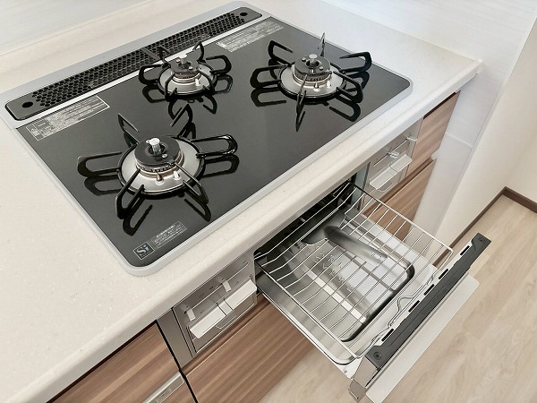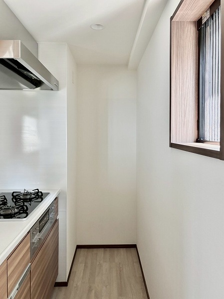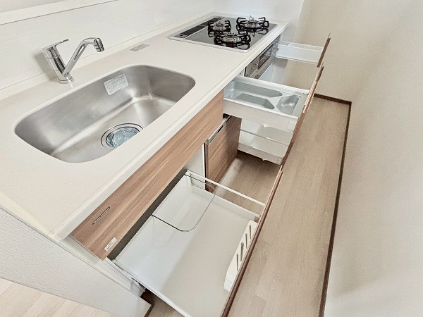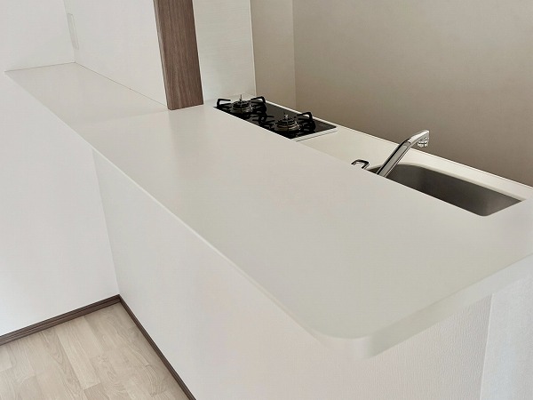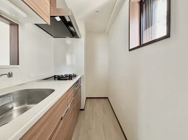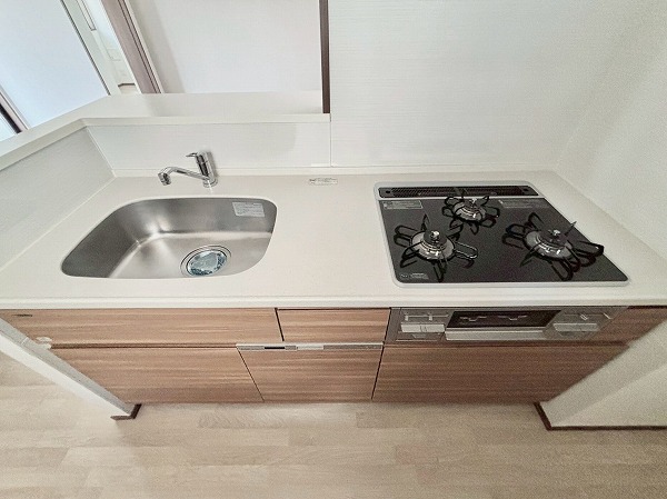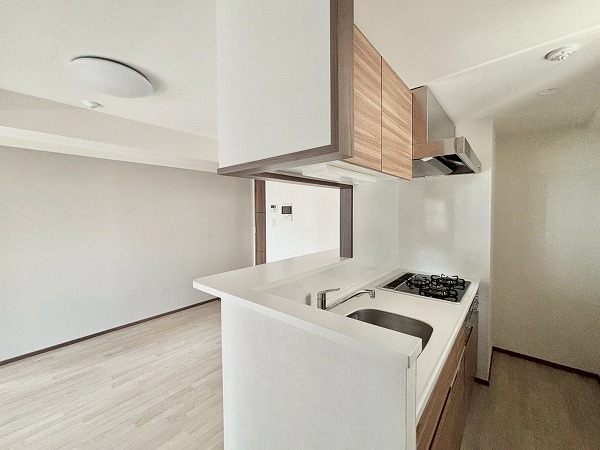 ホワイト×ブラウンの明るく清潔感のあるペニンシュラキッチン。小窓とカウンターが設けられていて、配膳や後片付けをスムーズに行えます。浄水器一体型の水栓や食洗機、3口のガスコンロを搭載しており、自炊はしやすいはず。