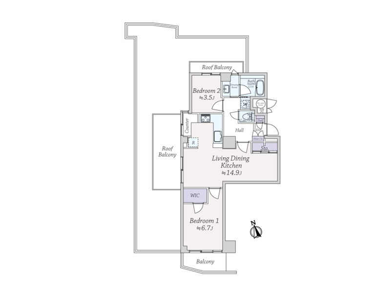 バルコニーは南・西・北の3方向に設けられており、開放感のあるつくりが特徴的。中でも西と北の2面はルーフバルコニーとなっており、5階部分ながら視界の抜ける景色を楽しむことができます。洗濯スペースとしてはもちろん、ガーデニングなど用途を分けて活用できるのも魅力です。