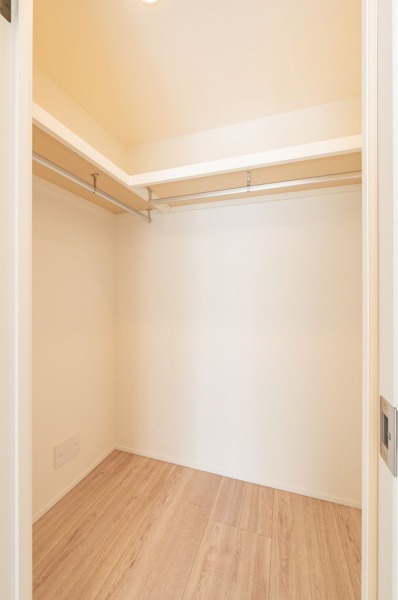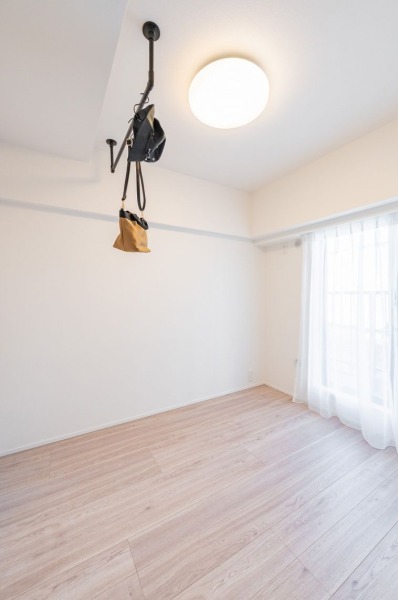 リビングダイニングキッチンに隣接する約6.7帖の洋室は、南向きの窓からたっぷりと光が差し込む心地よい空間。壁一面の開口部によって明るさがしっかり確保されており、開放的な印象を受けました。キングサイズのベッドも配置可能な広さがあり、主寝室としてゆとりを持って使用できそうです。ウォークインクローゼットも備わっているため、衣類や荷物の収納にも困りません。