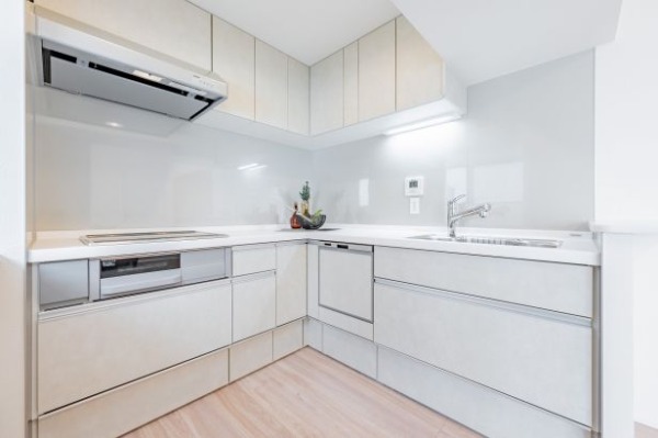 キッチンは新規交換されたシステムキッチンで、人気のL字型レイアウトを採用。作業スペースが広く、収納力にも優れているため、日々の調理が快適に行えます。窓際のカウンターには電子レンジや電気ケトルなどの家電を並べることができ、使い勝手の良さが感じられる設計です。