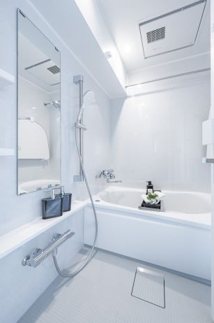 ホワイト基調の清潔感あるバスルーム。毎日の疲れを癒す空間はこのくらいシンプルがちょうどいいかも。ミラーは縦型を採用し、全身をチェックすることが可能。凹凸のあるフロアで滑りにくくいのも嬉しい設計。シャワーはスライドバーで高さ調節が可能です◎