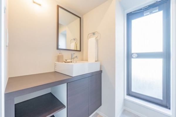 玄関から廊下を進んだ先に配置されたサニタリールームは、北側バルコニーへとつながるドアが設けられており、自然光が差し込む明るい空間。大きなミラーを備えた洗面化粧台にはベッセルタイプの洗面ボウルが採用され、ホテルライクな雰囲気が漂っていました。カウンターにゆとりがあるため、日々の身支度も快適に行えそうです。