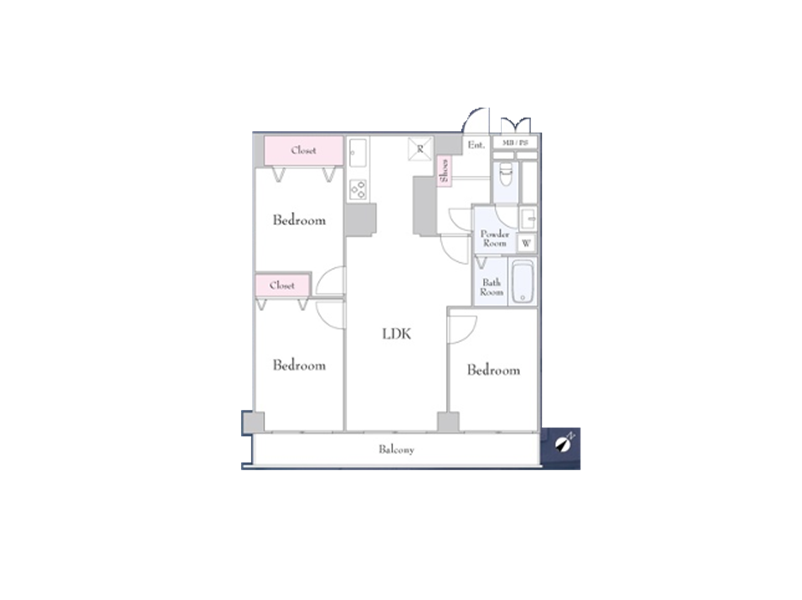 お部屋は7階部分、専有面積66.42㎡の3LDK。ファミリーにぴったりの使いやすい間取りです。玄関を開けると右手にシューズボックス、そして玄関ホールからすぐにパウダールームへ。洗面化粧台・洗濯機置き場・バスルーム・トイレと水回りが一か所にまとまっているため、毎日の家事動線スムーズ♪