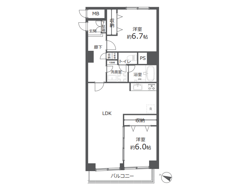 独立した6.7帖の洋室は、静かに過ごしたい方にぴったりのゆとりある広さ。ダブルベッドを配置できるため、主寝室としての使い勝手も十分◎落ち着いた時間が流れる快適なお部屋です。