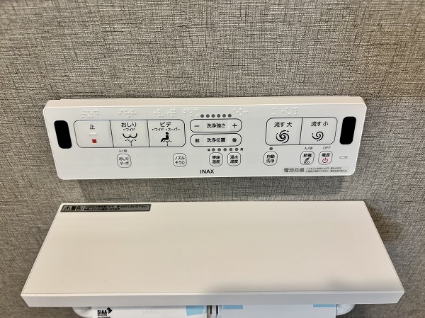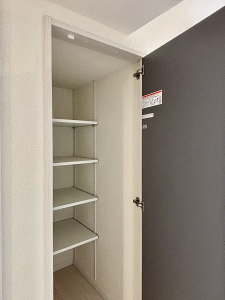 シンプルなデザインのトイレは、アクセントクロスが入ることで程よい個性を演出。手洗い一体型なので節水対策にもなるのが嬉しいポイント。もちろん温水洗浄便座付きで、快適な使用感が得られます。
