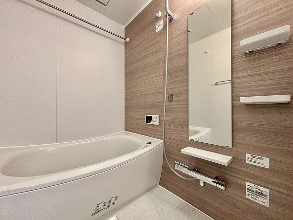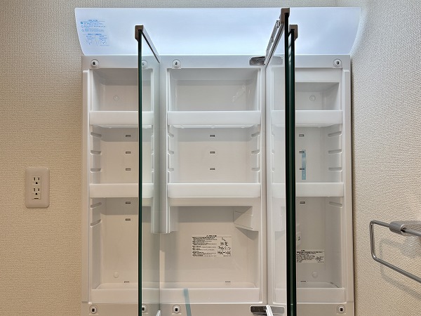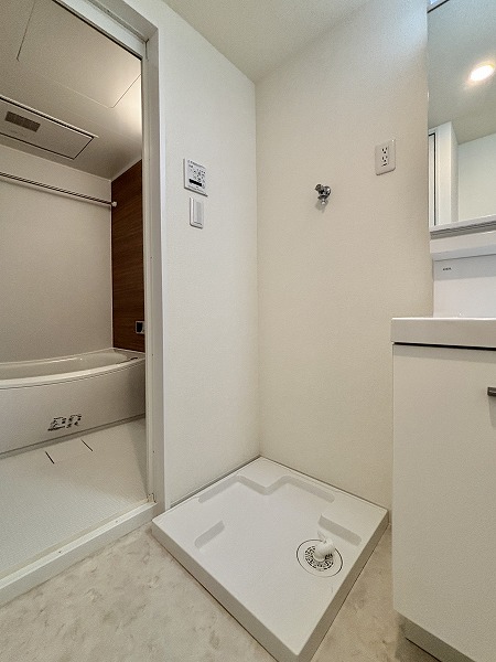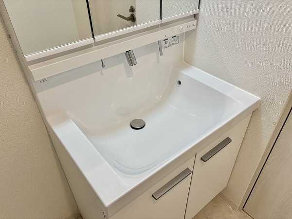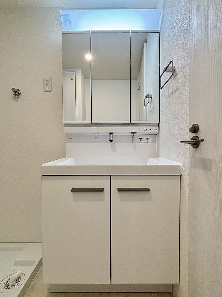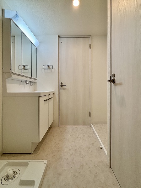 白をベースにしたサニタリースペースは、清潔で爽やかな雰囲気。洗濯機置き場・独立洗面台・バスルームが1ヶ所にまとまり、身支度がスムーズ。ミラーキャビネット仕様の洗面台は収納力が高く、細々したアイテムも整理できます✧毎朝の準備が気持ちよく進められそうですね。