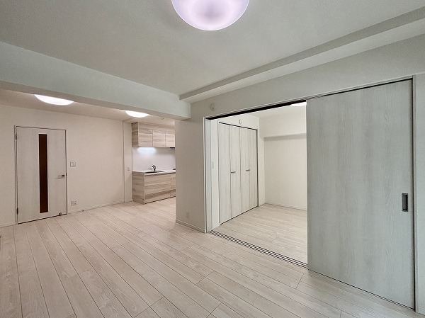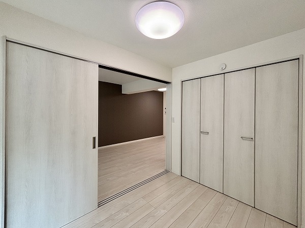 メインルームと隣接した約6.0帖の洋室。リビングとつながるスライドドアを開放すれば、自由度の高い開放的な空間に変化します。さらに大きなクローゼットも完備されているので、お荷物の多い方でも安心!