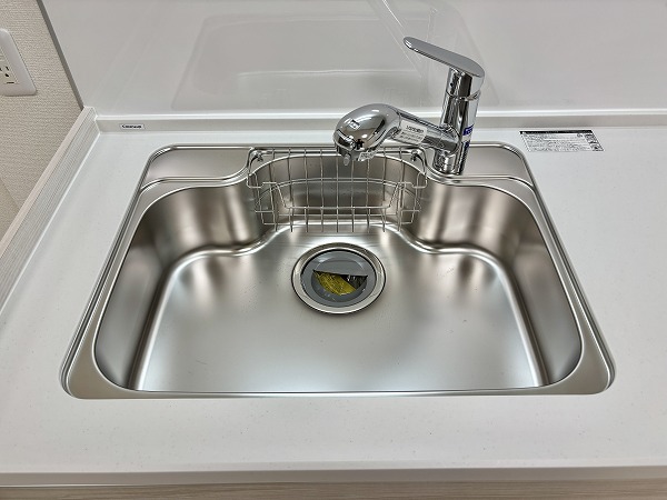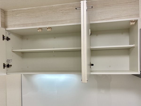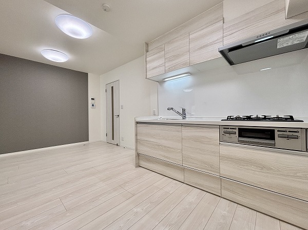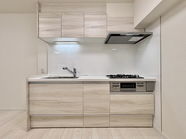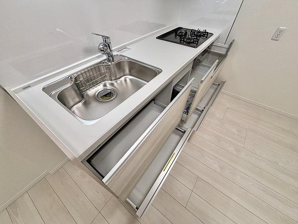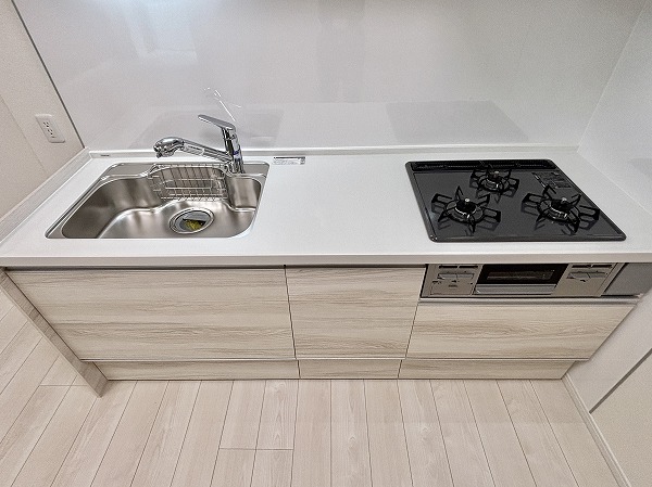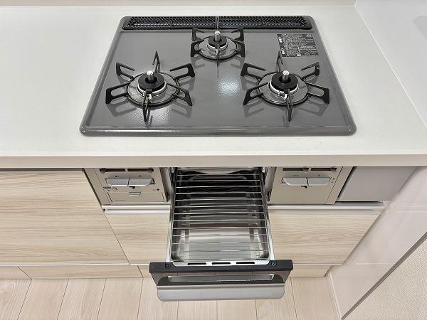 奥行きのあるキッチンは、収納家具を追加しやすいゆとりのレイアウト。3口コンロとグリル付きで、調理の効率がぐんと上がりそうです◎上下の収納が充実しているので、調理器具や食品ストックもしまいやすいのが魅力。清潔感のある空間で、毎日の料理が楽しくなりますね。