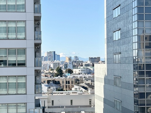 今回の3LDKの魅力はお部屋の外にもあるんです。こちらのワイドなL字型バルコニーは、25.73㎡。日当たり良好でとっても素敵な空間でした。しかもお天気の良い日には、建物の隙間から富士山も望めます♩