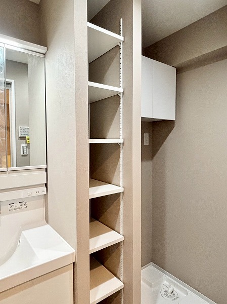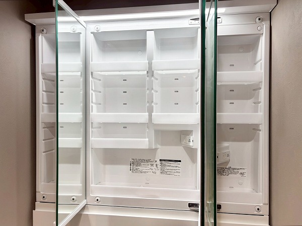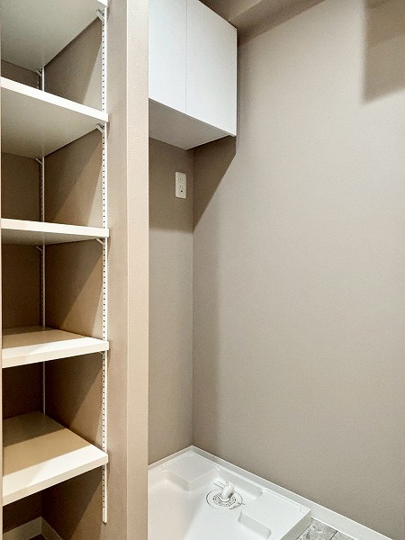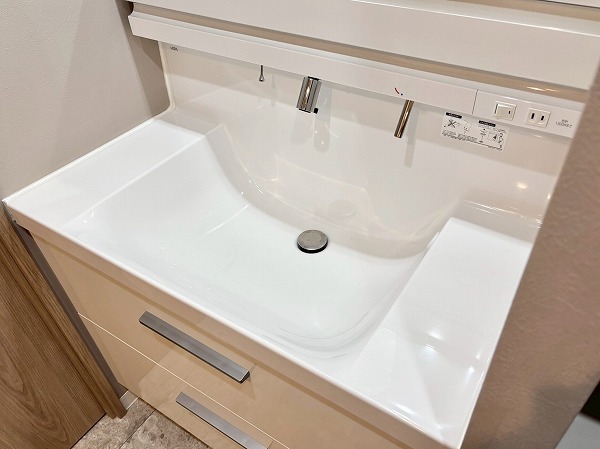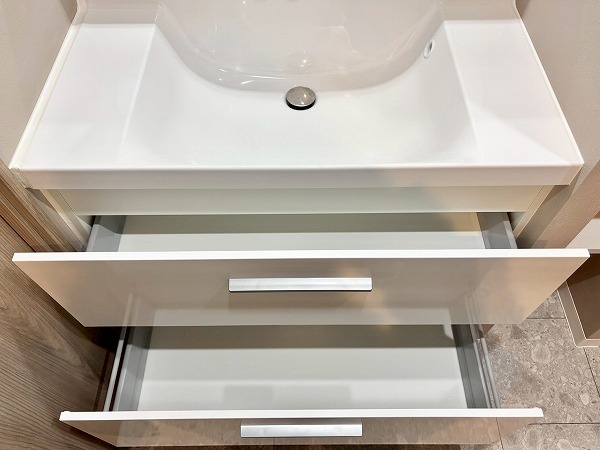サニタリールームは他のお部屋に比べるとややコンパクトに感じましたが、収納豊富で使い勝手が良さそうです。3面鏡の洗面化粧台は、水栓が洗面ボウルの上部についています。こうすることで水栓の根元に水が溜まりにくく、お掃除しやすいというメリットがありますよ。