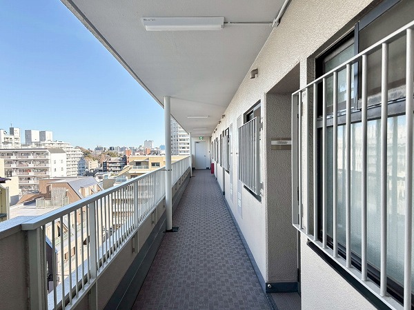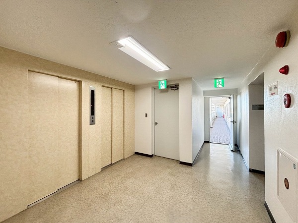 居住フロアは内廊下の部分と外廊下の部分の両方がありました。しっかりと清掃されていて、ゴミ1つ見当たりません。管理体制の良さが伺えますね。