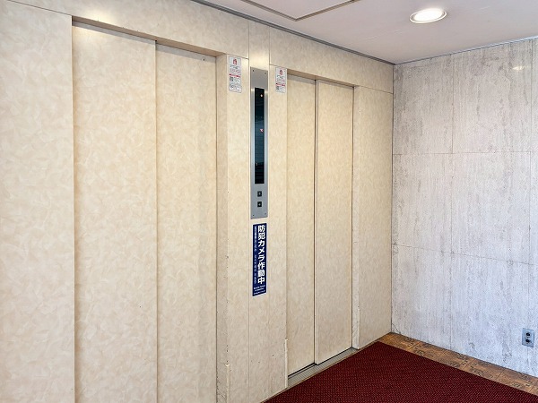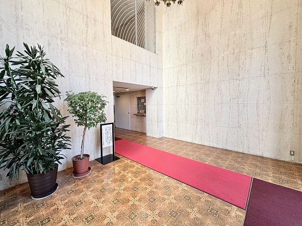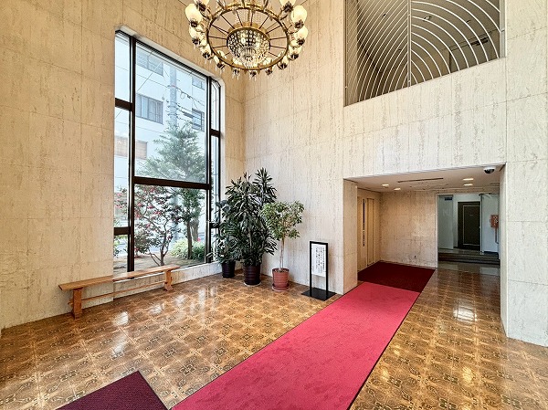 エントランスは天井が高く開放的♪レッドカーペットが敷かれ、シャンデリアが煌めく高級感のある空間です。カーペットを進むと2基のエレベーターが。