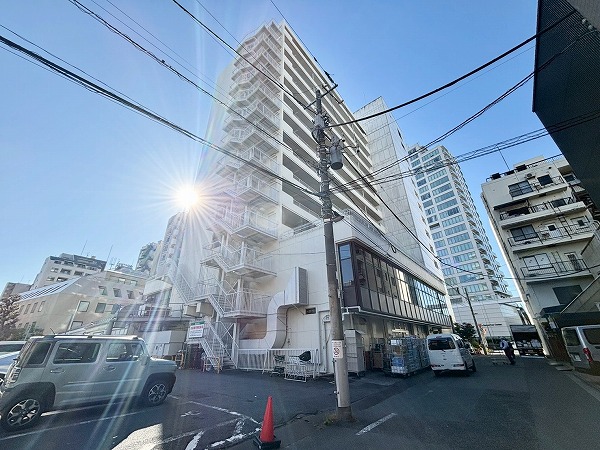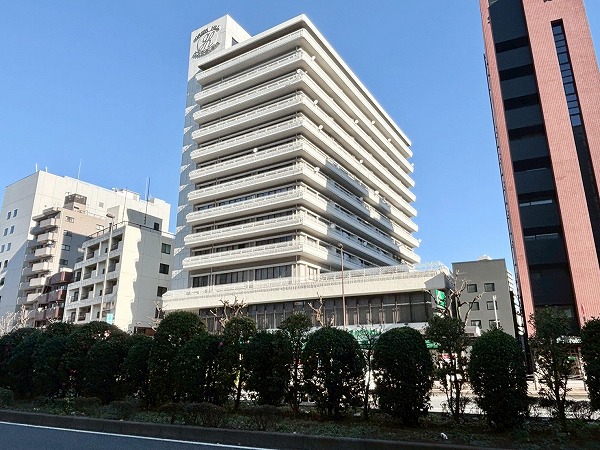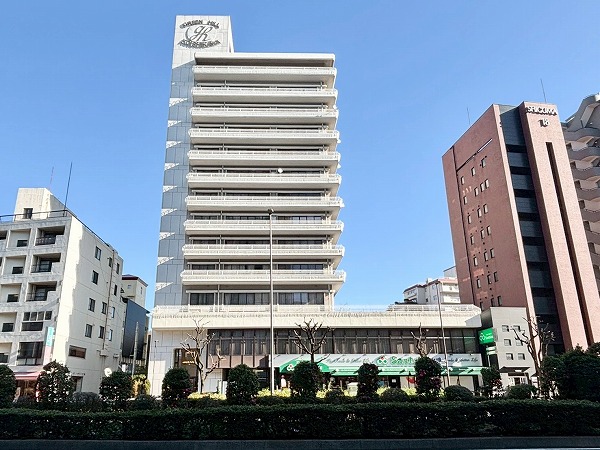 白くどっしりとした外観が印象的な『グリーンヒル小石川』。鉄骨鉄筋コンクリート造、地上12階建て総戸数は56戸です。1974年1月築の築古マンションですが、しっかり手入れされています。