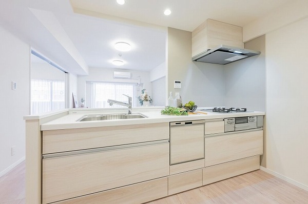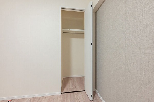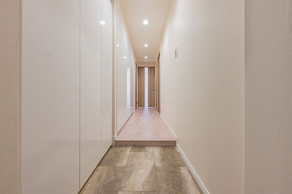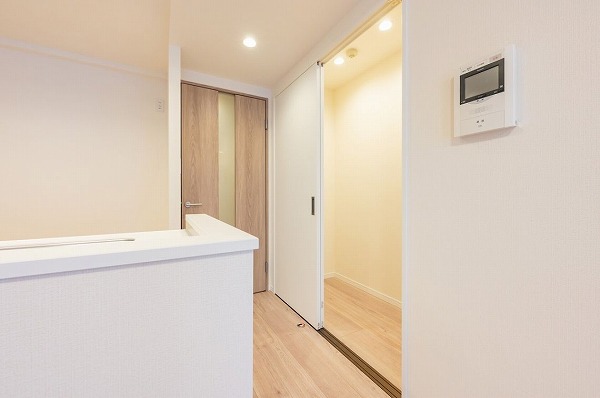 約16.0帖のメインルームはゆとりある広さがあり、リビングとダイニングを自然に分けて配置できる設計。ホワイトクロスと木目調フローリングのシンプルな組み合わせは、家具のテイストを選ばず、好みに合わせたコーディネートが楽しめます。対面式キッチンはリビングを見渡せる開放的な配置で、料理をしながら会話を楽しめるのも魅力。暮らしの中心として心地よく過ごせる空間です。玄関から続く廊下はすっきりとした印象で、壁一面に設けられた収納が実用的。日用品のストックや掃除道具などをまとめてしまえます。各居室は独立しているため、玄関から生活スペースが見えにくいのも安心感のあるポイント。