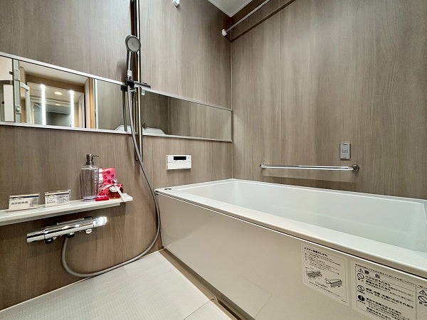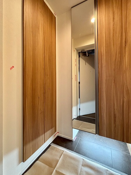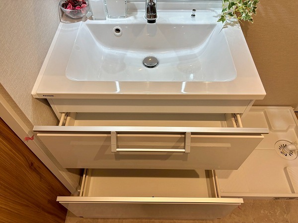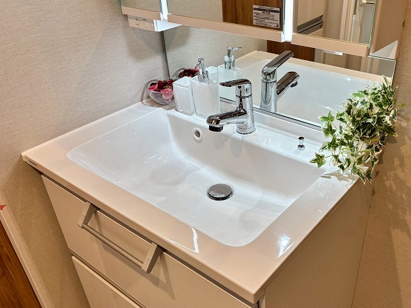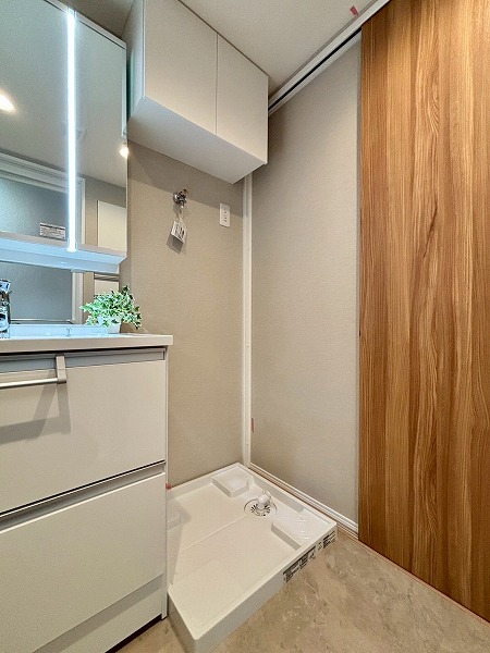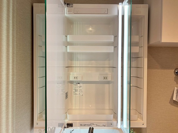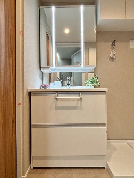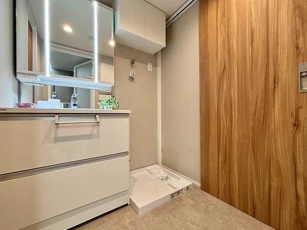 パウダールームは玄関正面に。ご帰宅後すぐに手を洗うことができて衛生的ですね!3面鏡タイプの洗面化粧台は、縦にLEDライトが2つ備わっていてお顔をしっかり照らしてくれます。メイクや髭剃りをスムーズに行えますね。
