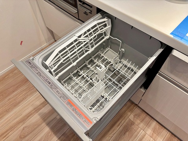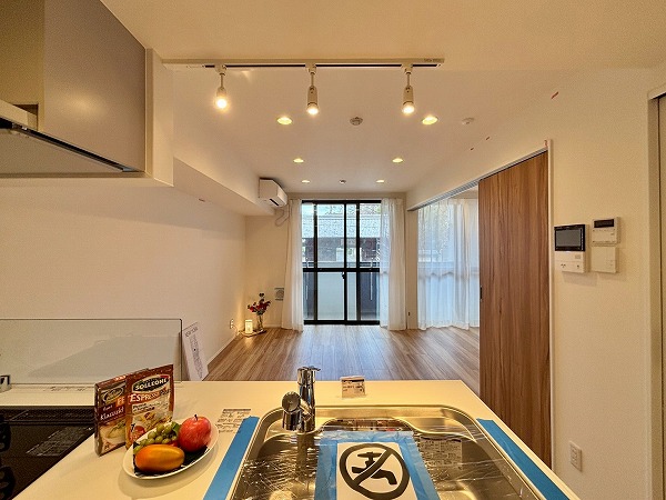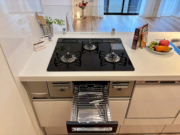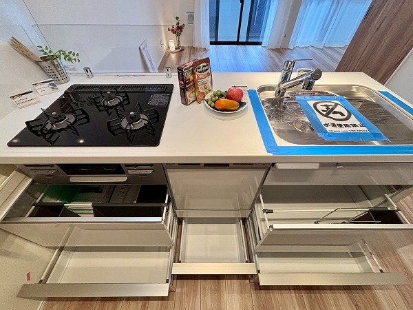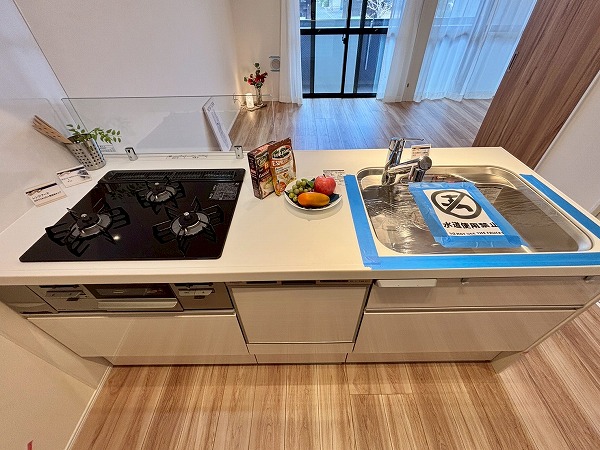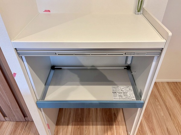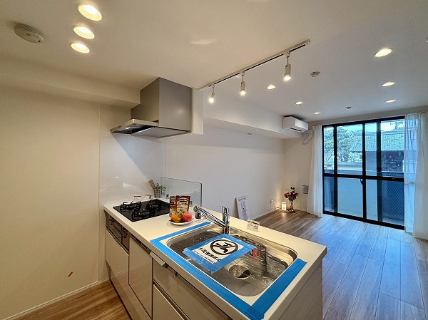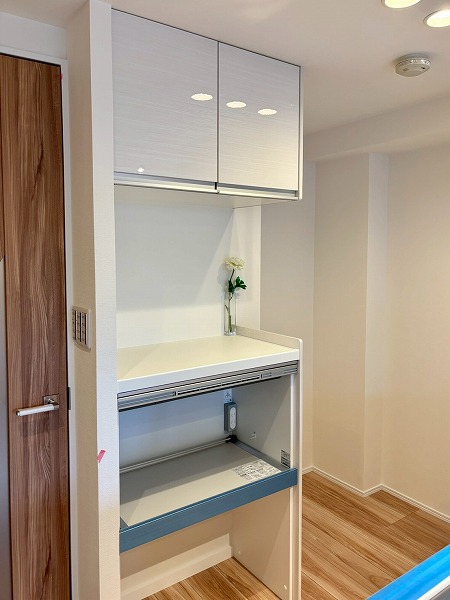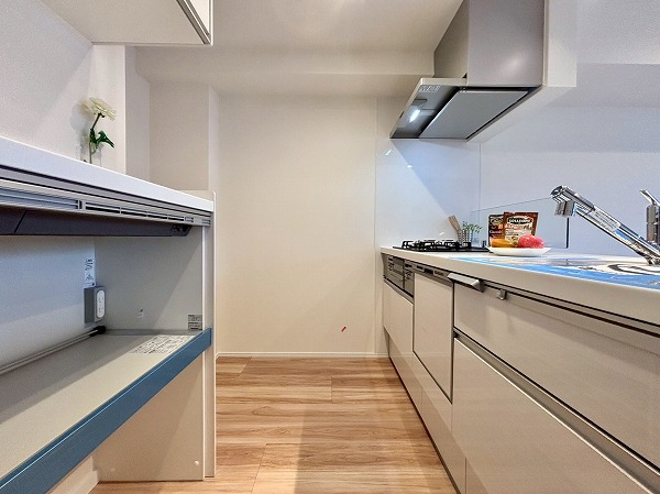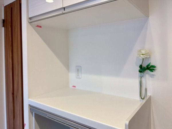 清潔感のある白を基調としたペニンシュラキッチンに新規交換されています。背面に同じデザインのカップボードがあり、お皿やカトラリーをすっきり整頓できます◎カップボードが炊飯器や電気ケトルなどの蒸気で痛むのを防ぐ蒸気排出ユニットが備わっていて、長い期間綺麗な状態を保てますよ。