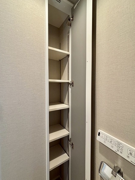 ベージュや白など優しい色合いで統一されたトイレ。節水効果が期待できる手洗い一体型を採用しています。キッチン上部に吊戸棚がある上に、壁面にも可動棚の収納が!トイレットペーパーなどをしまっておけば、座っていてもすぐ取り出せます。