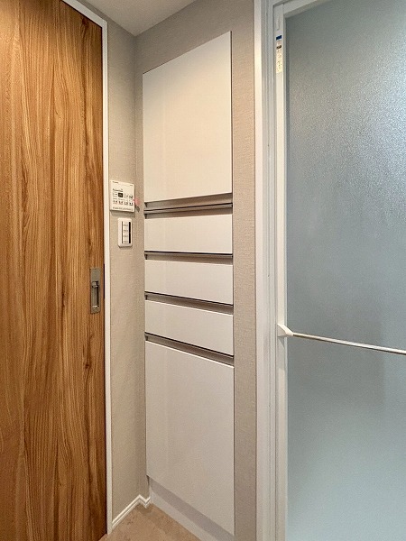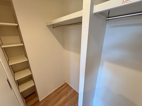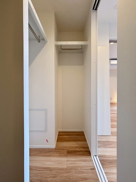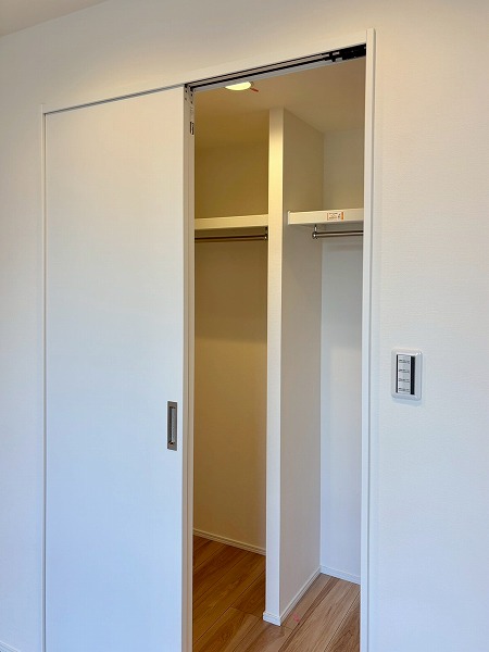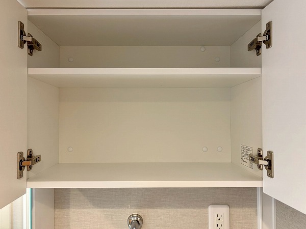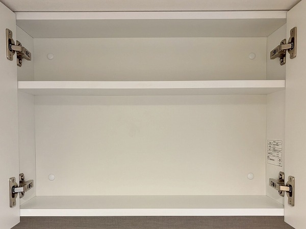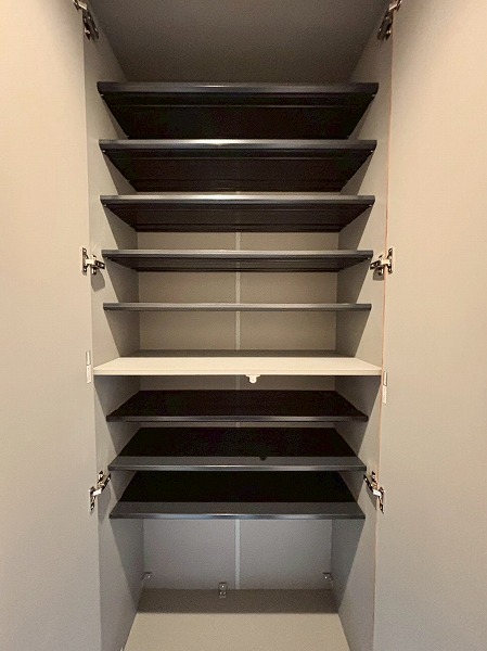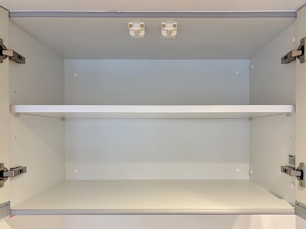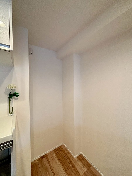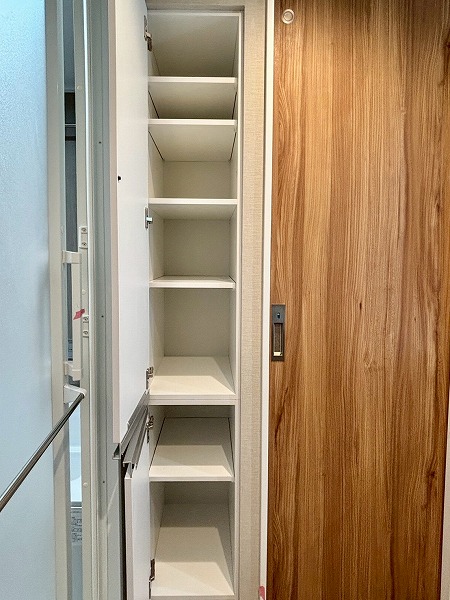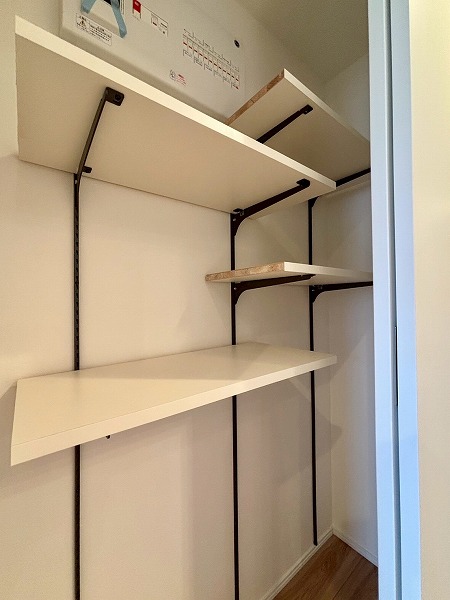 キッチン横には可動棚の収納が備わっています。幅が広いのでかなりたくさん物をしまえますよ。掃除機やフローリングワイパーなど、長さがあるお掃除道具もこちらで保管できそうですね。