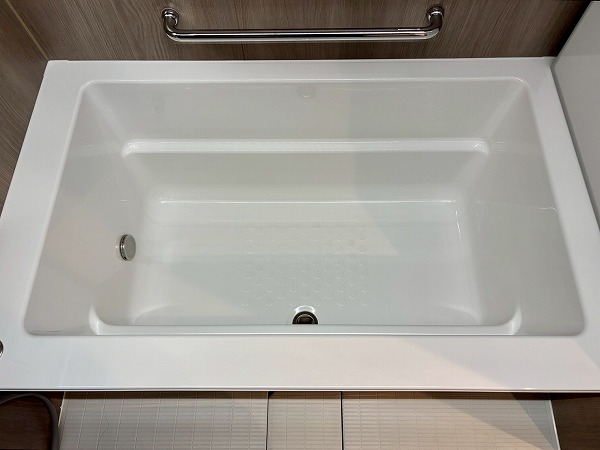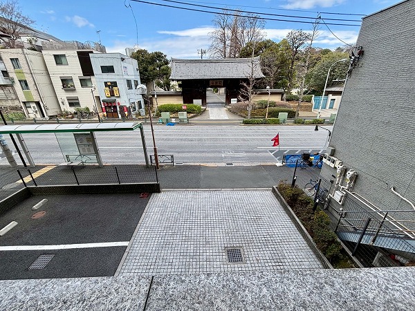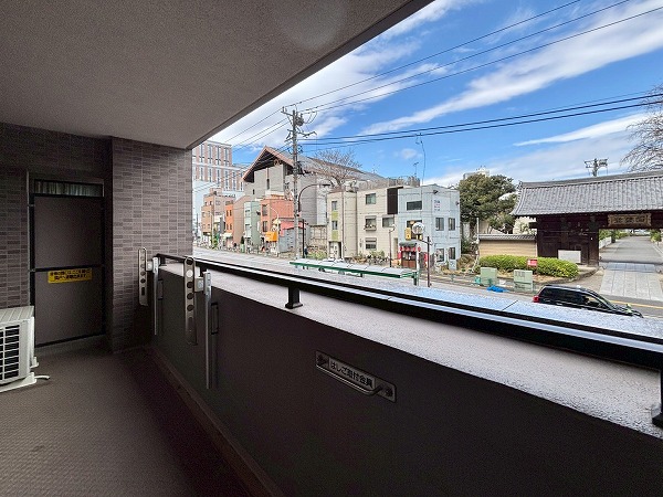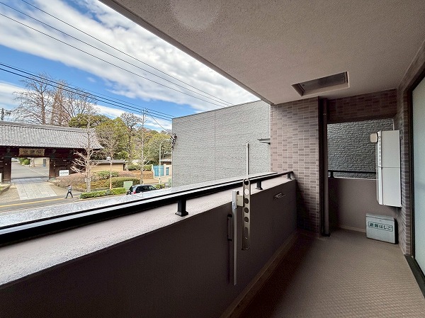 北向きのバルコニーは9.50㎡。横に長い造りになっていて、お洗濯物が干しやすそうでした。2階のお部屋ではありますが、歩道との距離があるため通行人の視線を気にせずに暮らせます。目の前が開けているのも嬉しいですね。