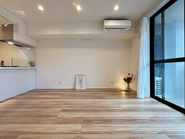 メインルームはおよそ10.8帖。1人~2人で暮らすには十分な広さですよね。木目調のお部屋に、大きな窓が開放感をもたらしています。エアコン&床暖房を完備しており、オールシーズン快適です。
