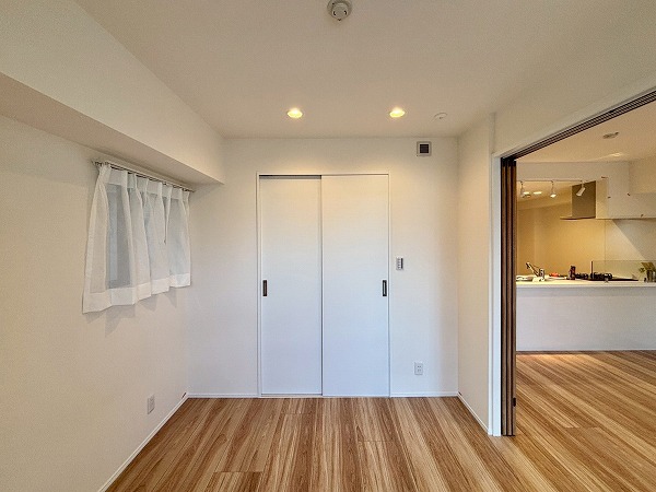 洋室はおよそ4.9帖とちょっぴりコンパクト。ローベッドや低めのマットレスを使用すれば空間を広く見せることができオススメ。メインルームとの戸を開けて、広めのワンルームとして使うのもいいかもしれません。