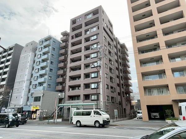「不忍通り」沿いにそびえる地上11階建てのマンション、『ペイサージュ音羽壱番館』。株式会社土地住販分譲、総戸数38戸のマンションです。通りから少し距離があるため、マンション内のプライベート性が高まっていますよ。
