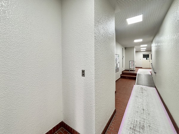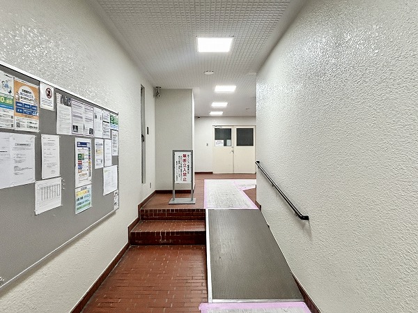 細い道を進み、階段かスロープを利用して先へ。エレベーターが1基備わっていました。12階建てのマンションなので時間帯によっては混雑することもあるかもしれません。外階段があるので、そちらで行き来することが可能です。
