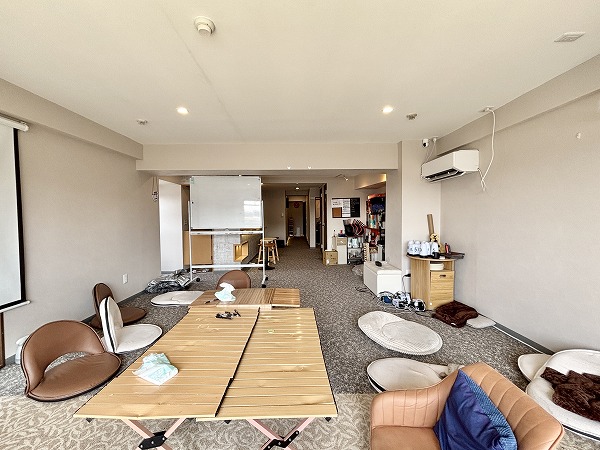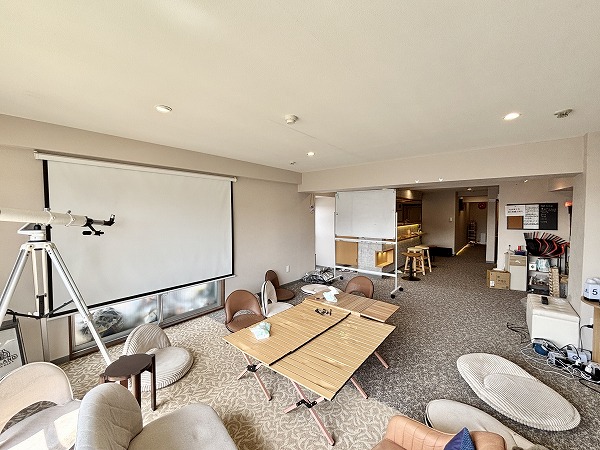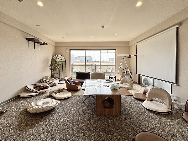 メインルームにはバルコニーに繋がる大きな窓があり開放的です。カーペットが敷かれており、冬場でも快適に過ごすことができそう!写真のように椅子を並べて、談笑しながらまったり過ごすのも素敵ですね。
