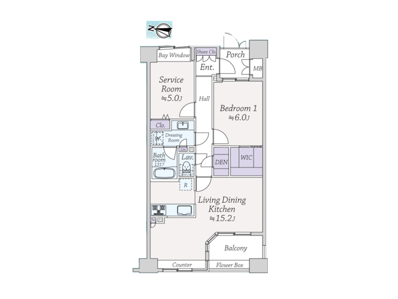 サービスルームは約5.0帖を確保し、コンパクトながら使い勝手の良い空間。ベッドを置いて寝室として使うのはもちろん、書斎や在宅ワークスペースとしても活躍します。窓付きで空気がこもりにくい点も魅力です。